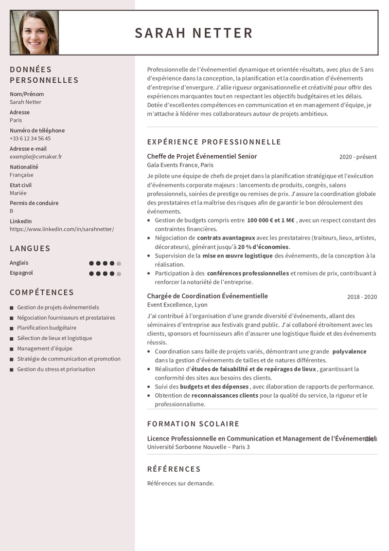Cet exemple de CV est ici pour illustrer nos propos et vous inspirer pour rédiger le vôtre. Notre outil de création CVBuilder vous permet de créer rapidement et facilement un CV professionnel, et vous permet de choisir parmi plusieurs modèles de CV adaptés au métier de l'évènementiel disponibles en téléchargement.