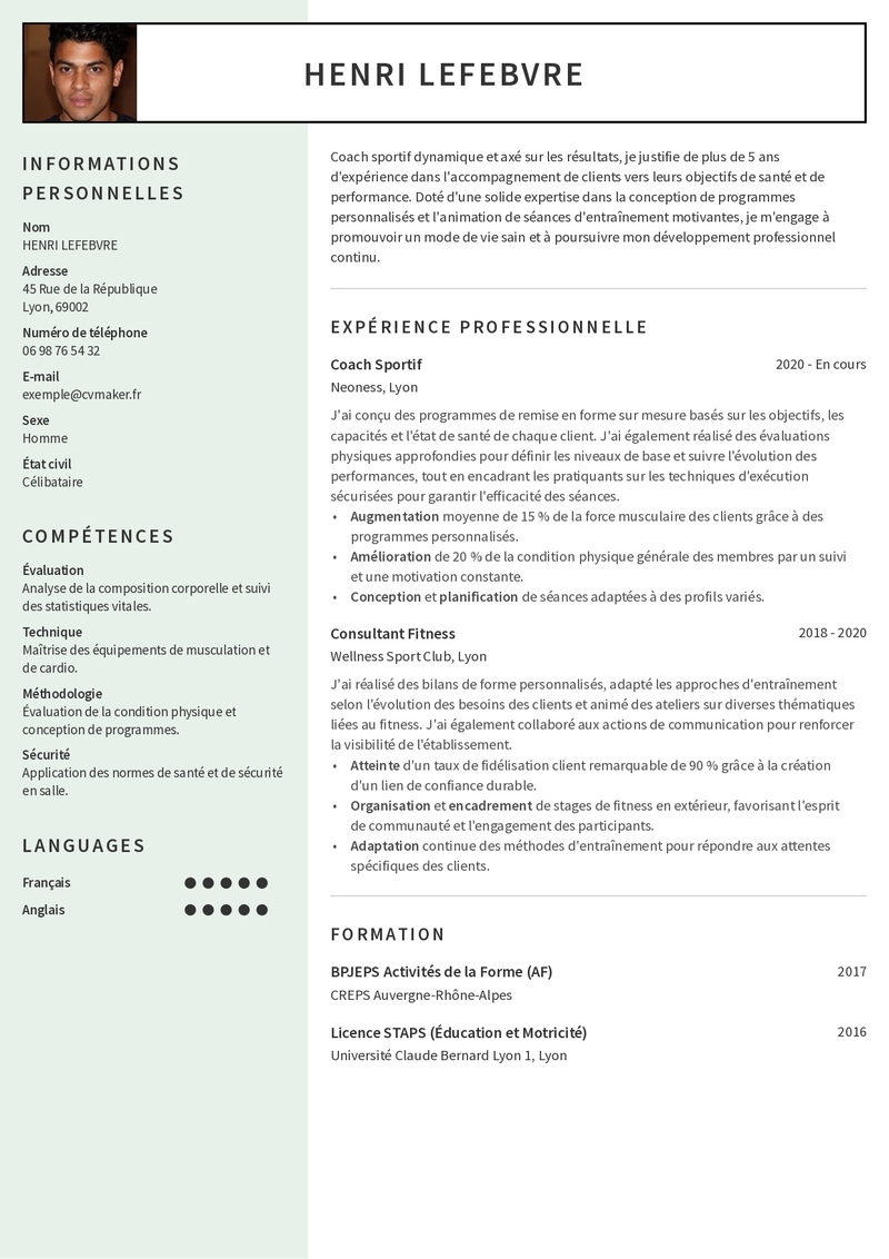 La photo reste facultative en France, mais elle est souvent appréciée dans les métiers de contact comme le coaching sportif. Elle humanise votre candidature et aide le recruteur à mémoriser votre profil.