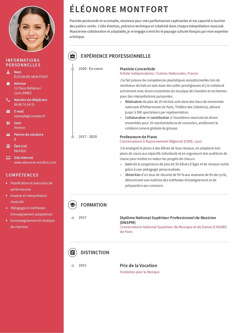 Éléonore Montfort est une pianiste concertiste de grand talent, dotée d’un parcours d’excellence alliant performance scénique et pédagogie. Grâce à une structure claire et des titres percutants, elle permet aux recruteurs d'identifier immédiatement ses atouts majeurs. Éléonore a su valoriser ses six années d'expérience pour mettre en lumière l’équilibre entre ses compétences techniques et ses qualités humaines, faisant d'elle la candidate idéale. En s'appuyant sur un modèle de CV sobre et élégant, elle souligne sa valeur unique avec une esthétique professionnelle parfaitement adaptée aux standards exigeants du milieu culturel français.